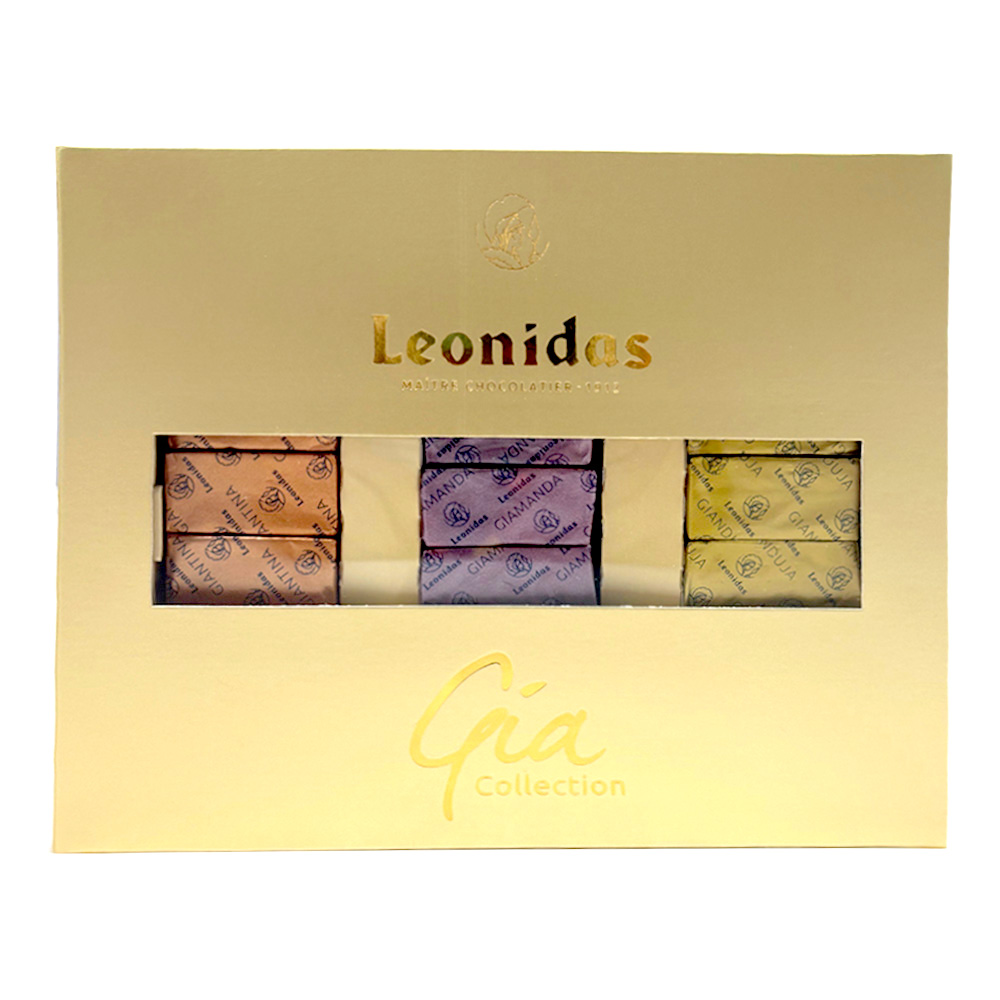 Cutia Gia’s Leonidas este un cadou elegant și rafinat, ce reunește cele trei sortimente iconice de praline Gia: Gianduja, Giantina și Giamanda.